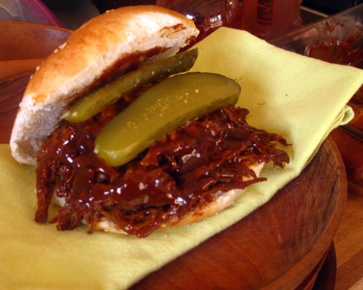 Place some shredded pork in a skillet with some BBQ sauce. Heat through and place inside a sandwich roll. Top with sliced pickles and serve. Enjoy!