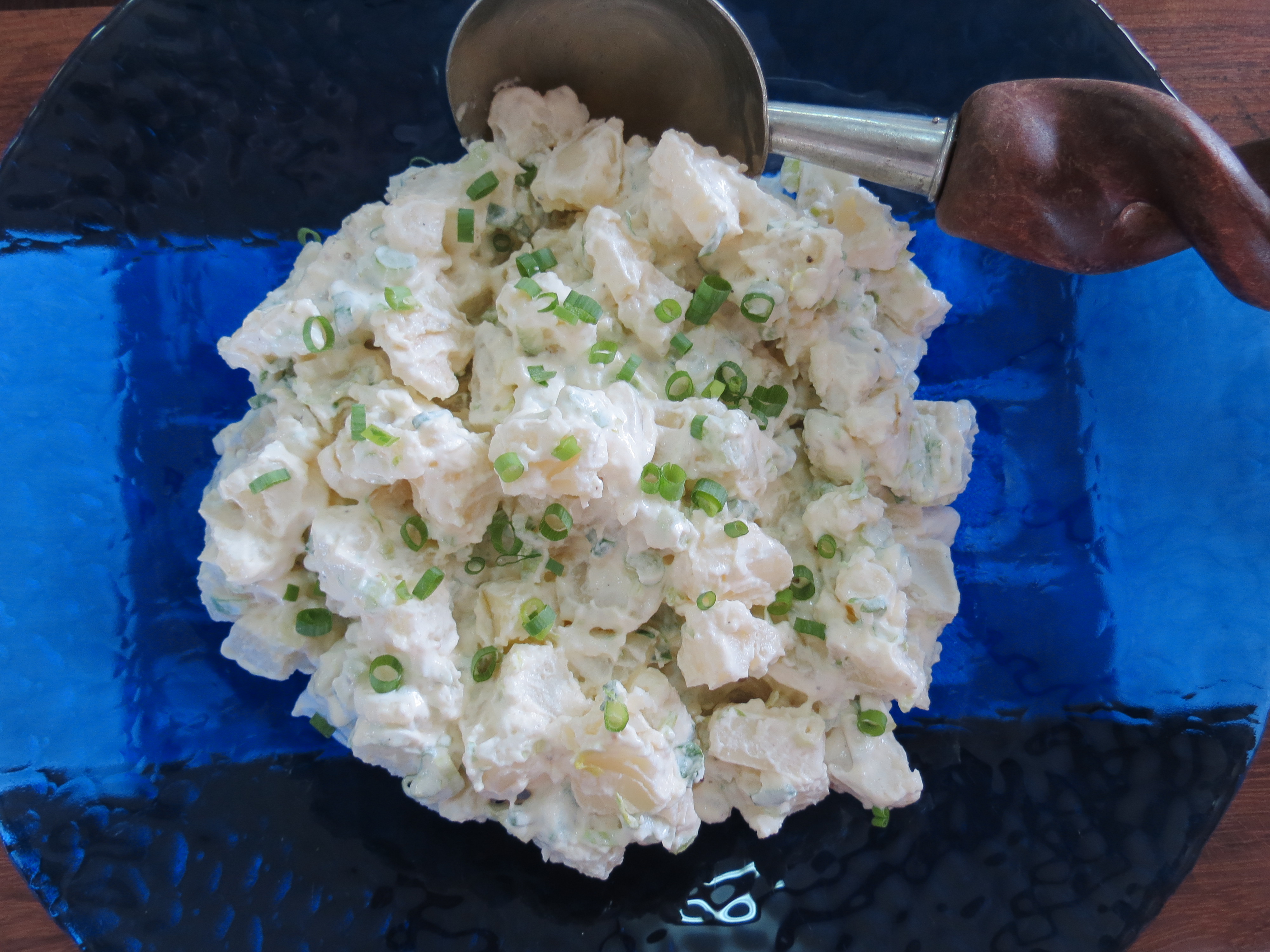Serve your potato salad with extra scallion greens on top as a garnish. Enjoy.