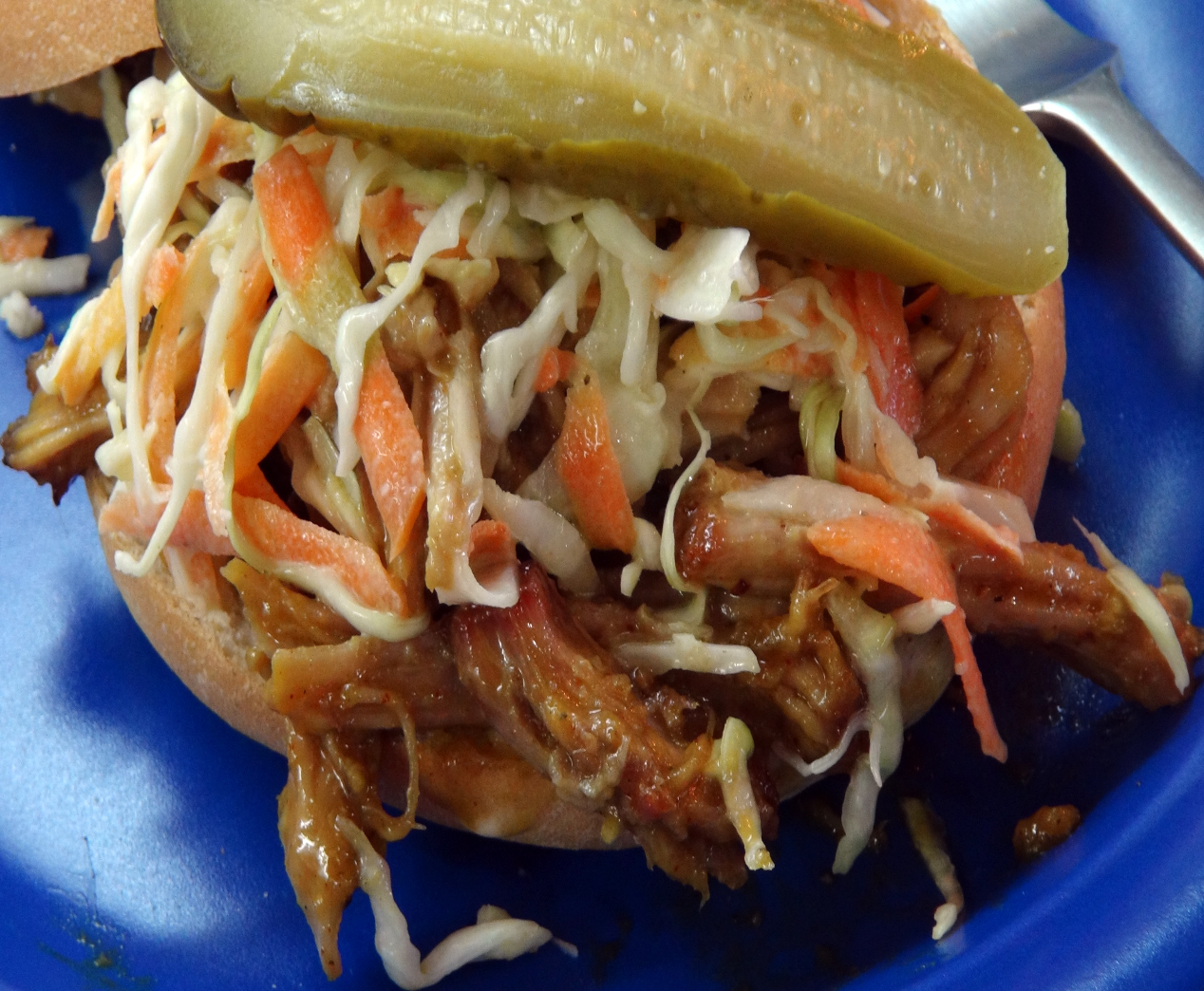 Remove pork from the pan and allow it to cool down. Pull it and place it in a large skillet. Add your bbq sauce of choice, mix to coat well and heat through. Serve in a roll with Cole-slaw and a pickle slice. Enjoy!