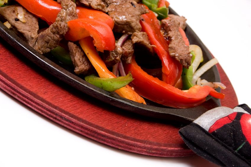These beef fajitas are made with marinated flank steak. The meat is tender and flavorful and is served in a tortilla with onions and peppers. The ultimate meal.