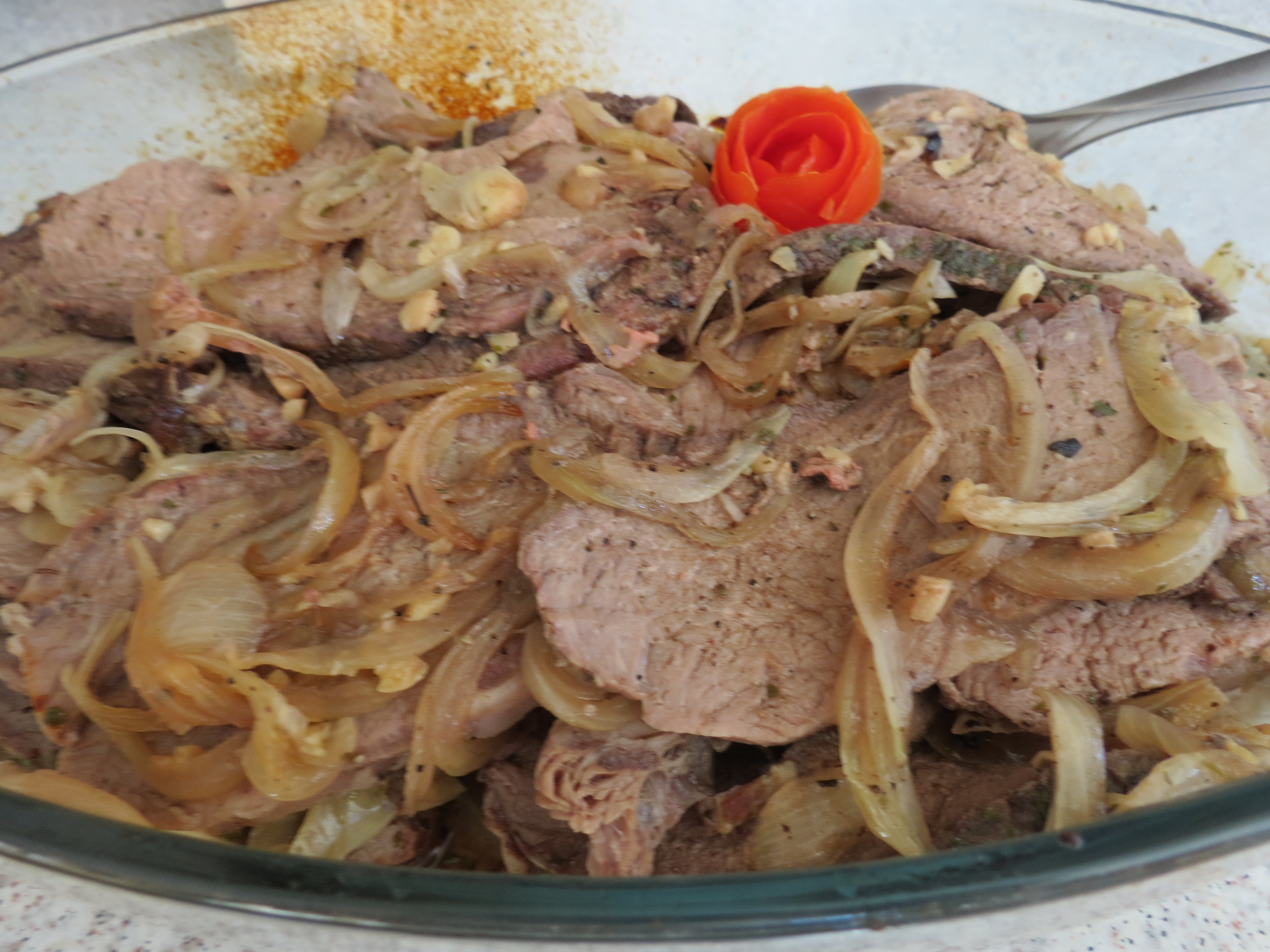 Remove the meat from the oven and allow it to sit for a few minutes. Cut it into thin strips and discard the fat. Return the sliced meat to the rendered juice and mix it with the cooked onions and garlic. Serve with your favorite side. I love this with mashed potatoes.