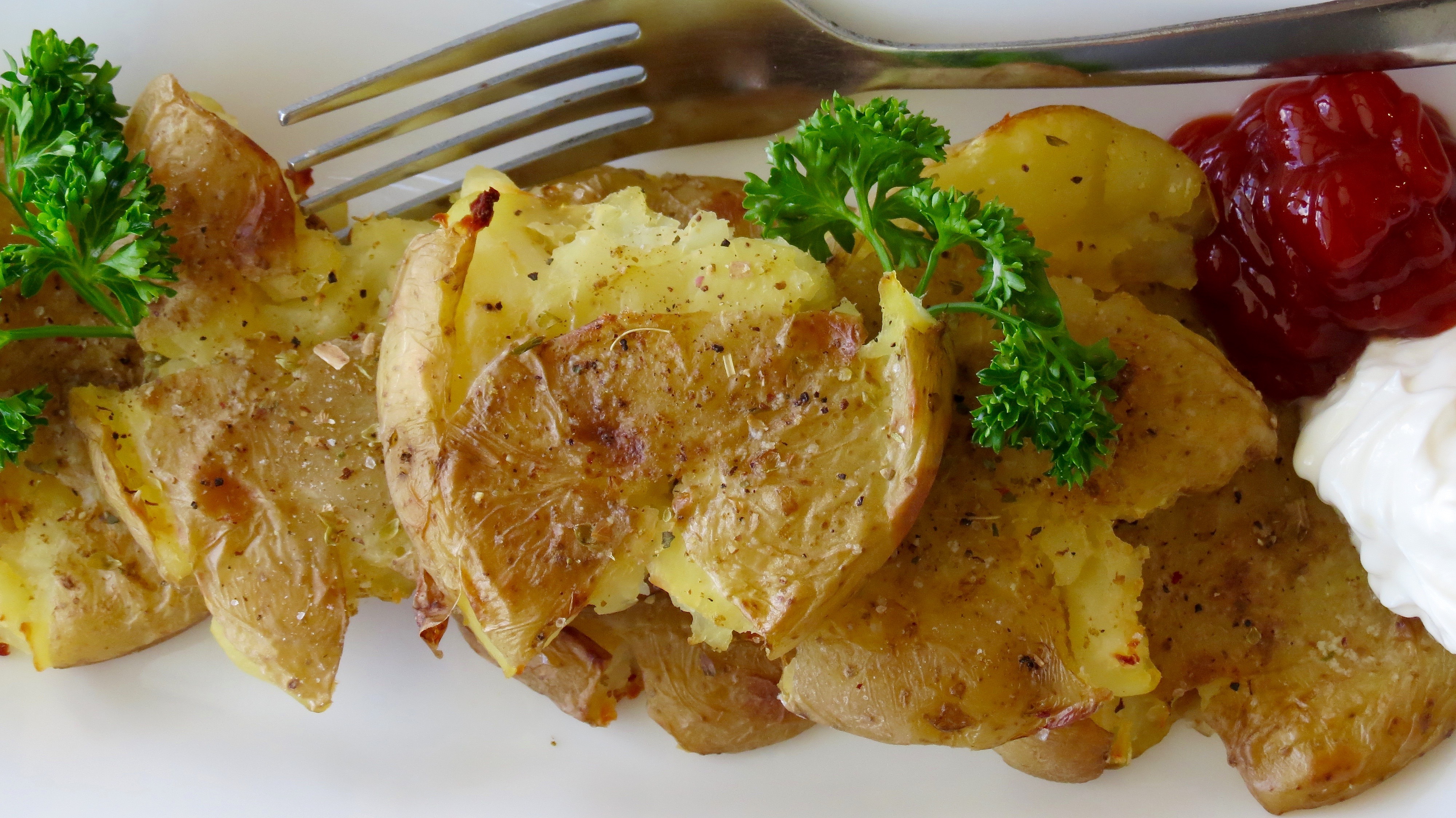 Estas papas crocantes al horno se hierven en agua con sal y luego se aplastan. Una vez aplastadas se las condimenta con comino, orégano, sal y pimienta y se las mete al horno. Son una verdadera delicia para comer como guarnición.