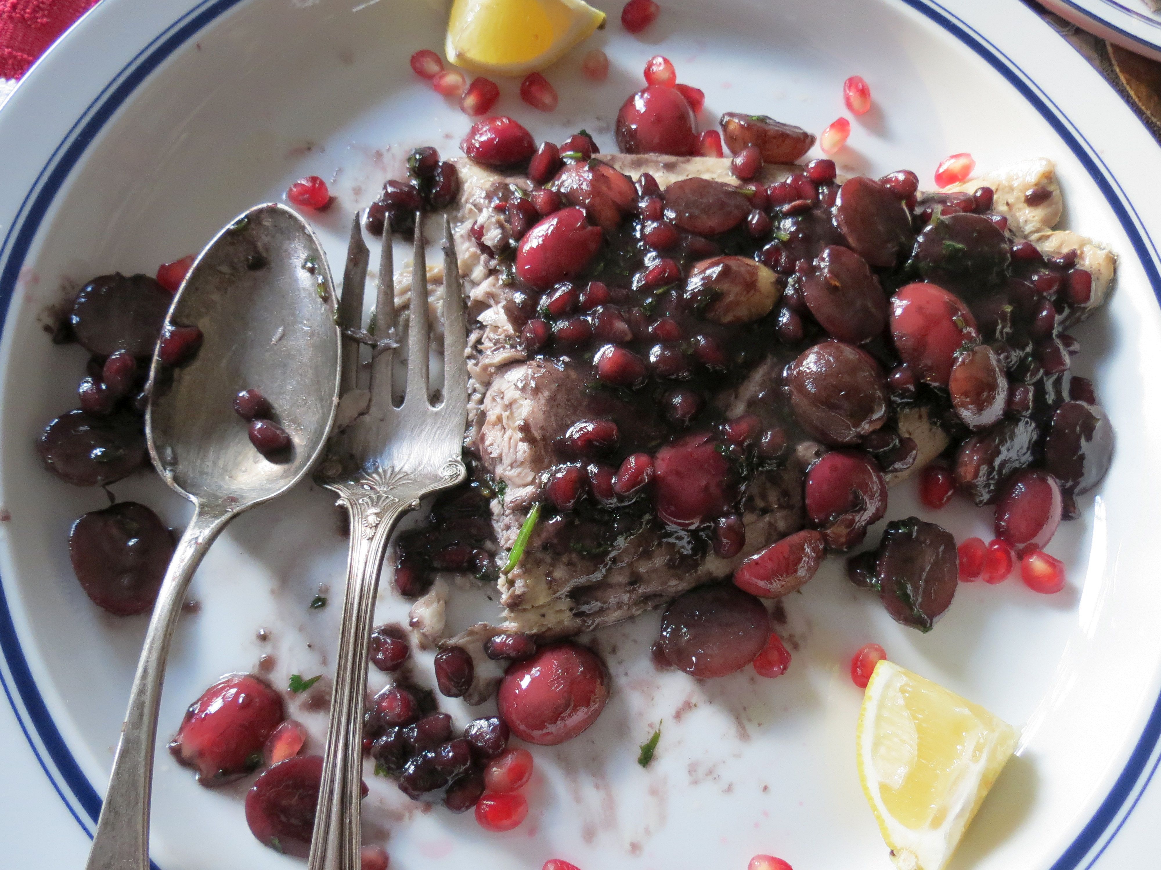 Este pescado con uvas tiene granada también. Lo vamos a hacer en el horno y servir con una salsa delicada. Este platillo es muy elegante y muy fácil de hacer. Yo use Dorado para