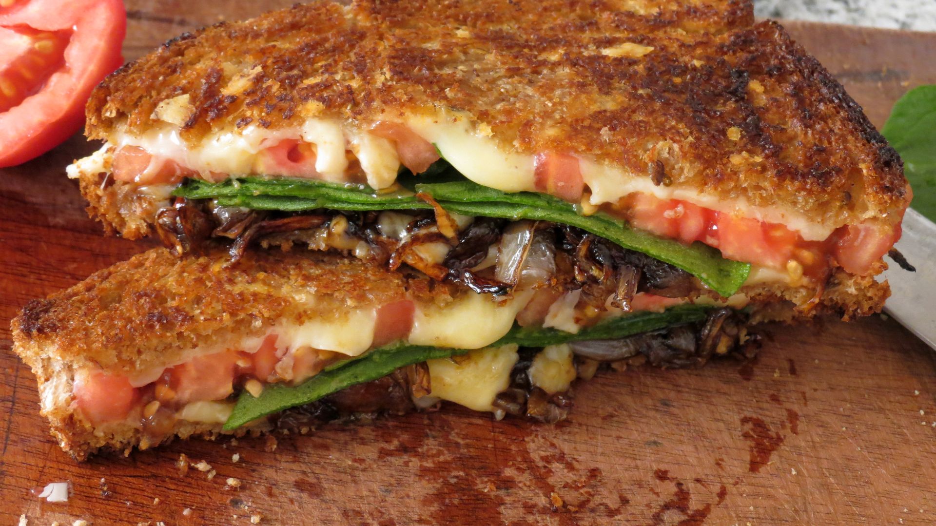 Step-by-step instructions on how to make grilled cheese. This sandwich is made on the stove and is loaded with shredded cheese, caramelized onions, tomato slices and spinach. It is