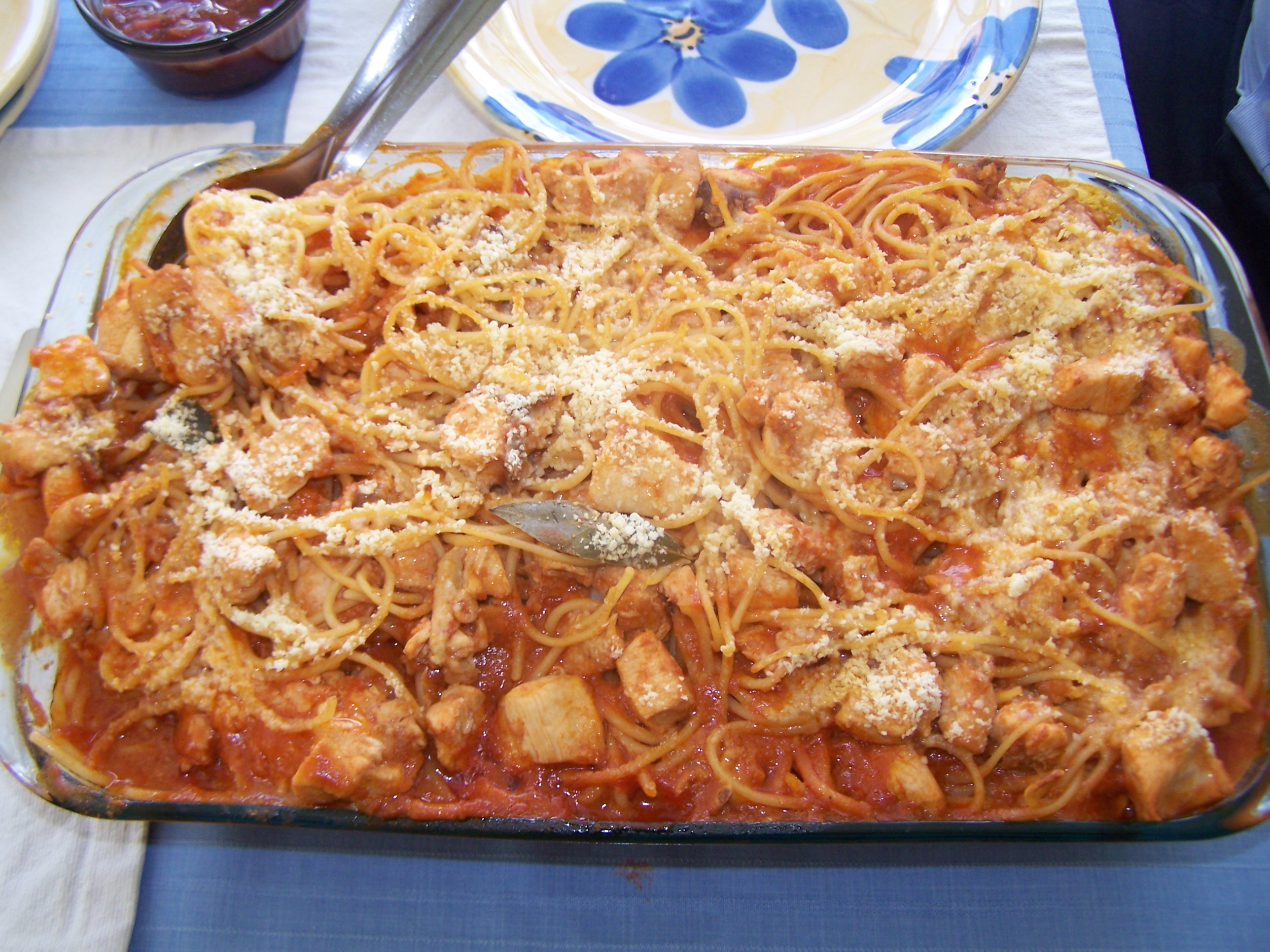 This easy chicken spaghetti recipe is made with cubed chicken breast that we will cook in a tomato sauce. We will then mix in some cooked spaghetti and trasfer it to a baking dish.