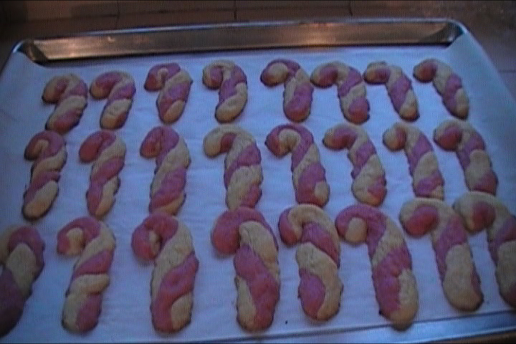 These Xmas cookies are shaped like candy canes. They are colorful, crisp and a lot of fun to make with kids. This is a soft dough that needs to be refrigerated prior to being baked