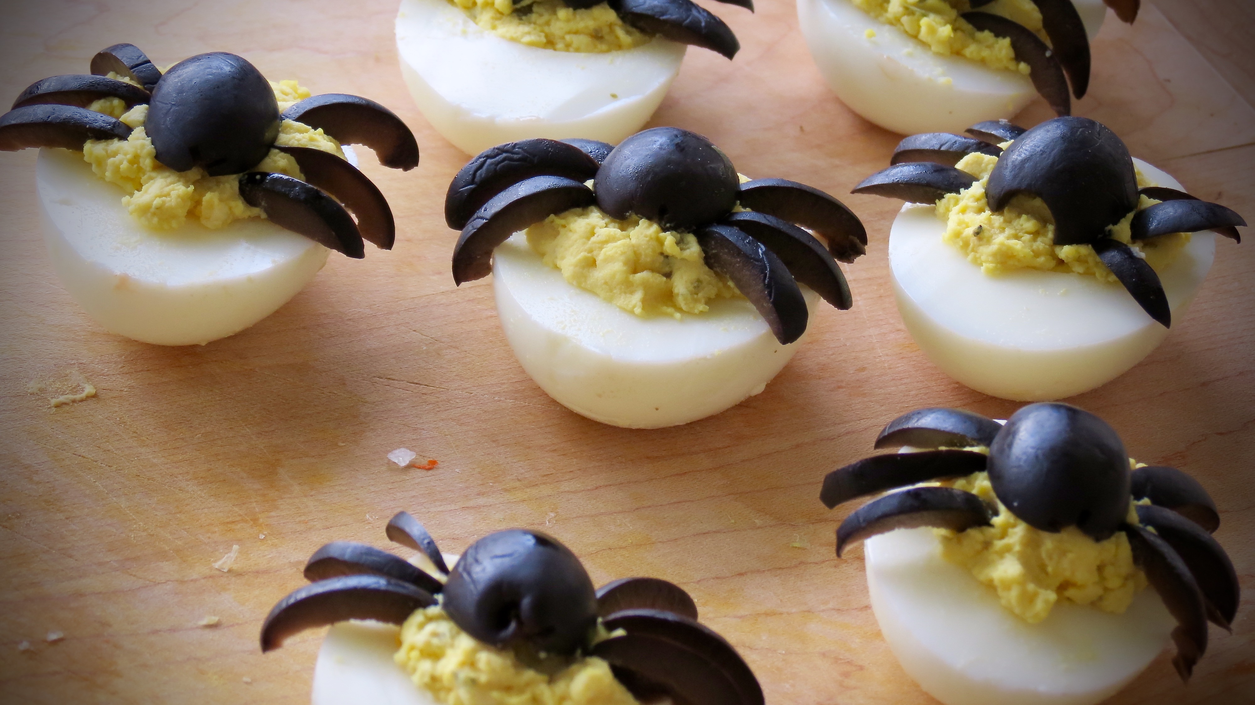 These healthy Halloween snacks are made with hard-boiled eggs and olives. We are going to prepare the egg yolks with some mustard, mayo and capers and then form the spiders. If you